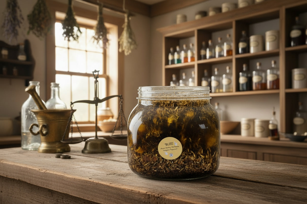 When creating a batch of Blitz arnica and comfrey salve or Hush lip and body balm, or any other herbal oil, we start by first infusing the herbs into extra virgin olive oil. This process takes at least 6 weeks. After carefully measuring out the oil and the required dried herbs into the gallon sized jar, the jar is then placed inside of our kitchen cabinets where it sits until the infusing has taken place.