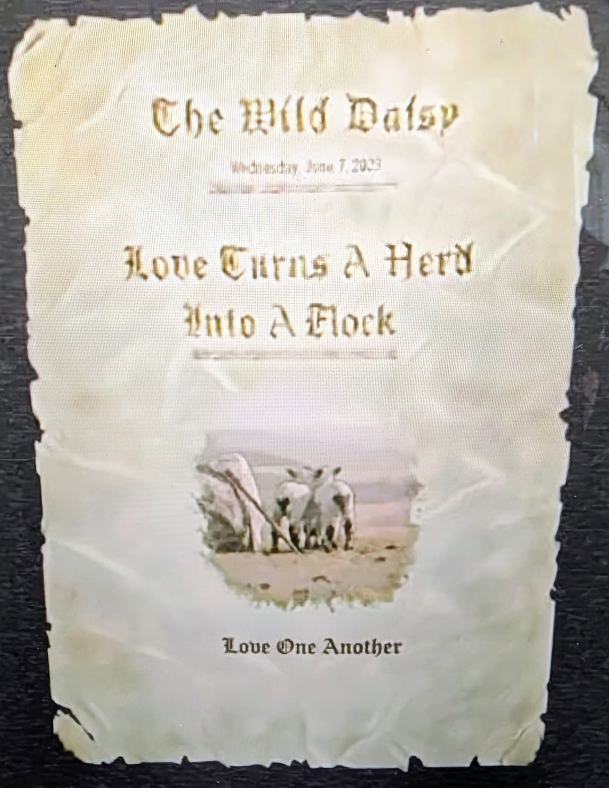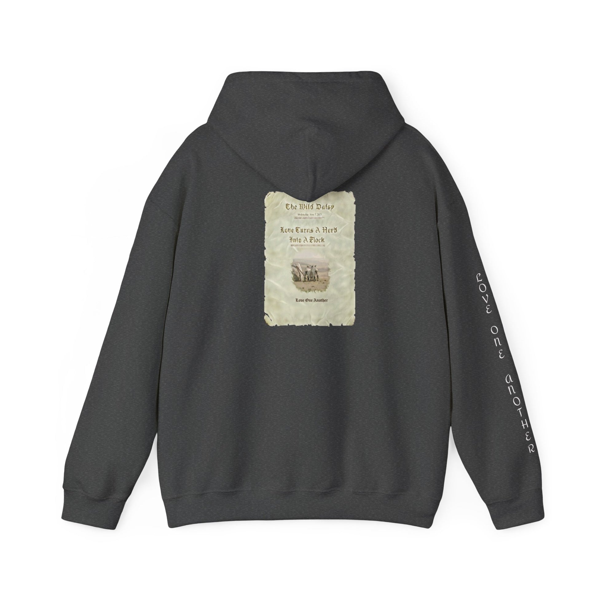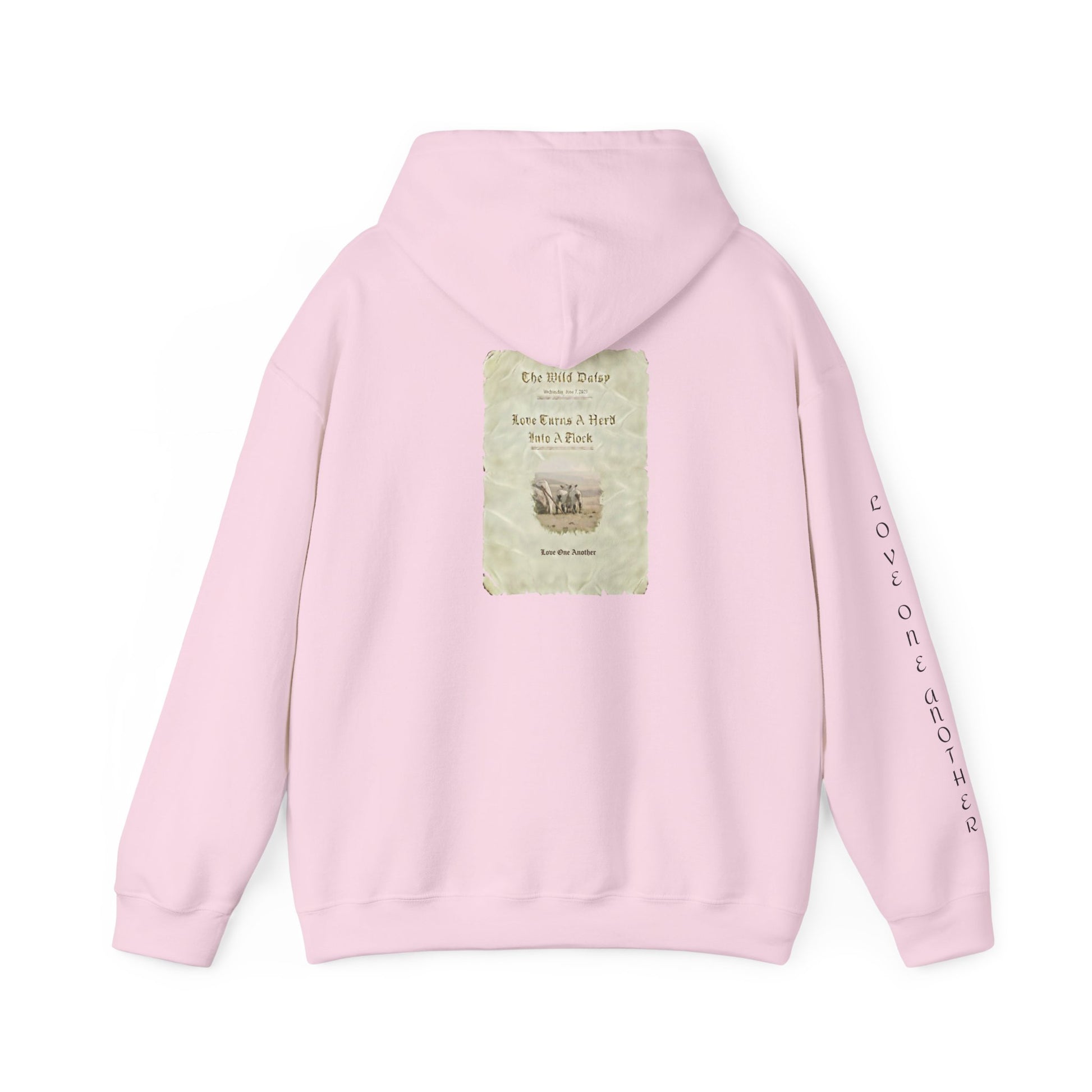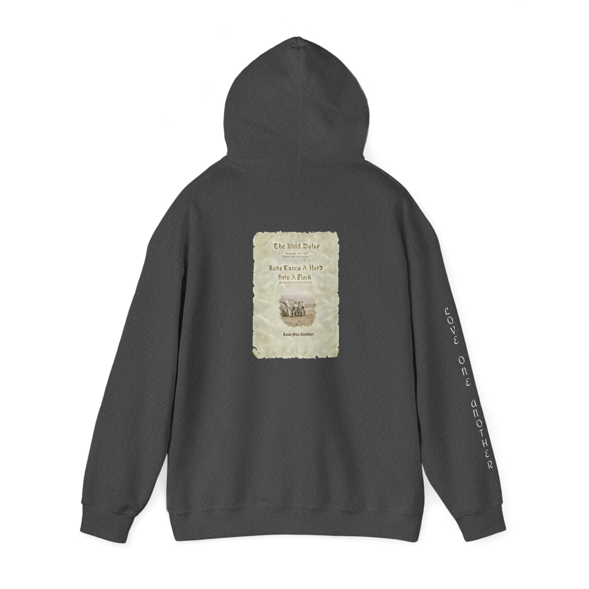 The back of the hoodie features a detailed vintage newspaper graphic, complete with an aged paper texture and torn edges. The powerful headline "Love Turns A Herd Into A Flock" sets the theme of community and divine care. Below it, the serene image of the lambs created using an actual photo of them at 4 weeks old—our "Heart Lambs"—stands as a symbol of gentle love. The design is completed by the timeless biblical commandment from Jesus: "Love One Another."